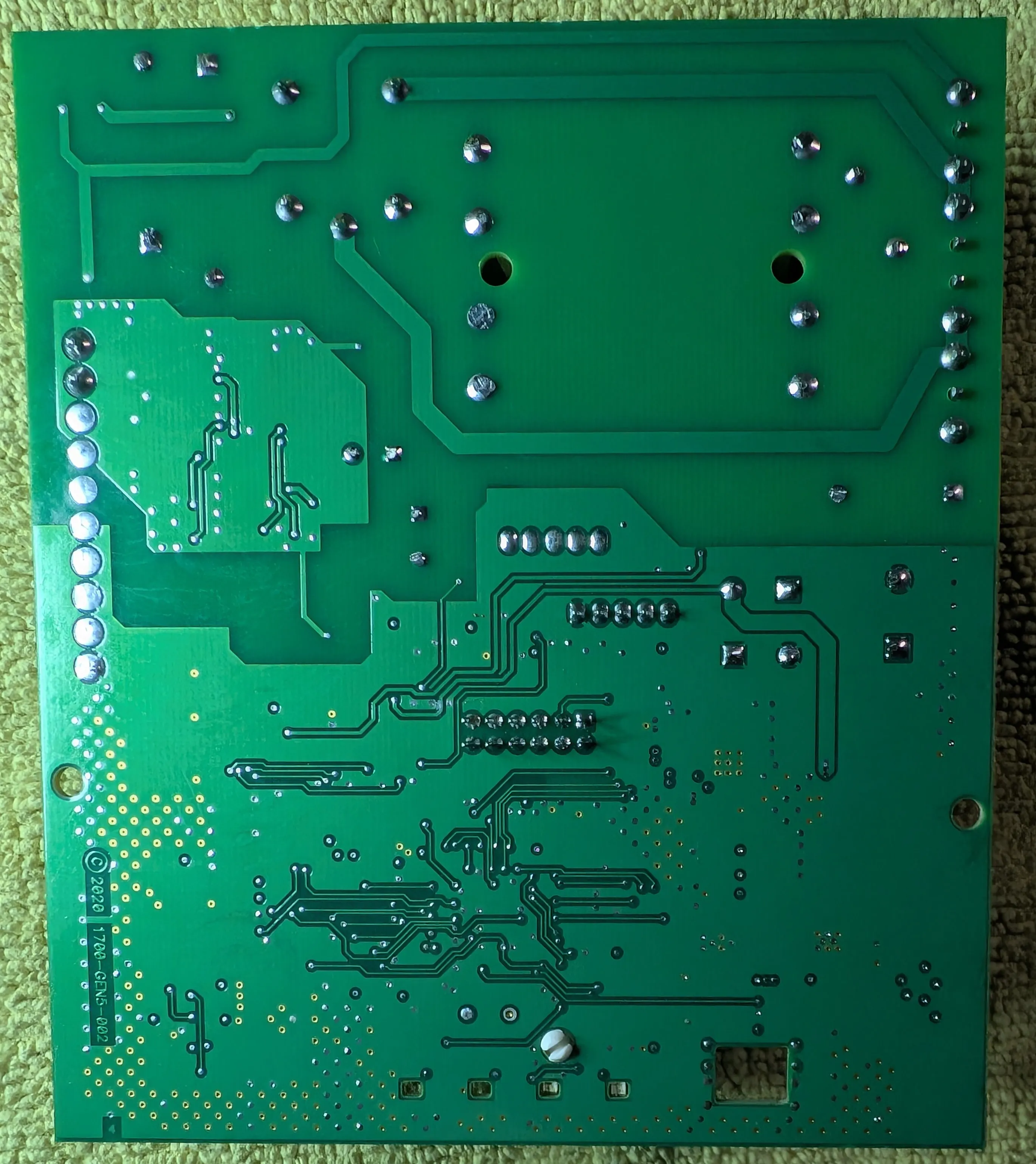 There really isn’t much to see on the bottom of the main PCB. Big traces for the mains side of things, lots of clearance around everything else and a lot of ground plane stapling/via-stitching on the low voltage side of things.