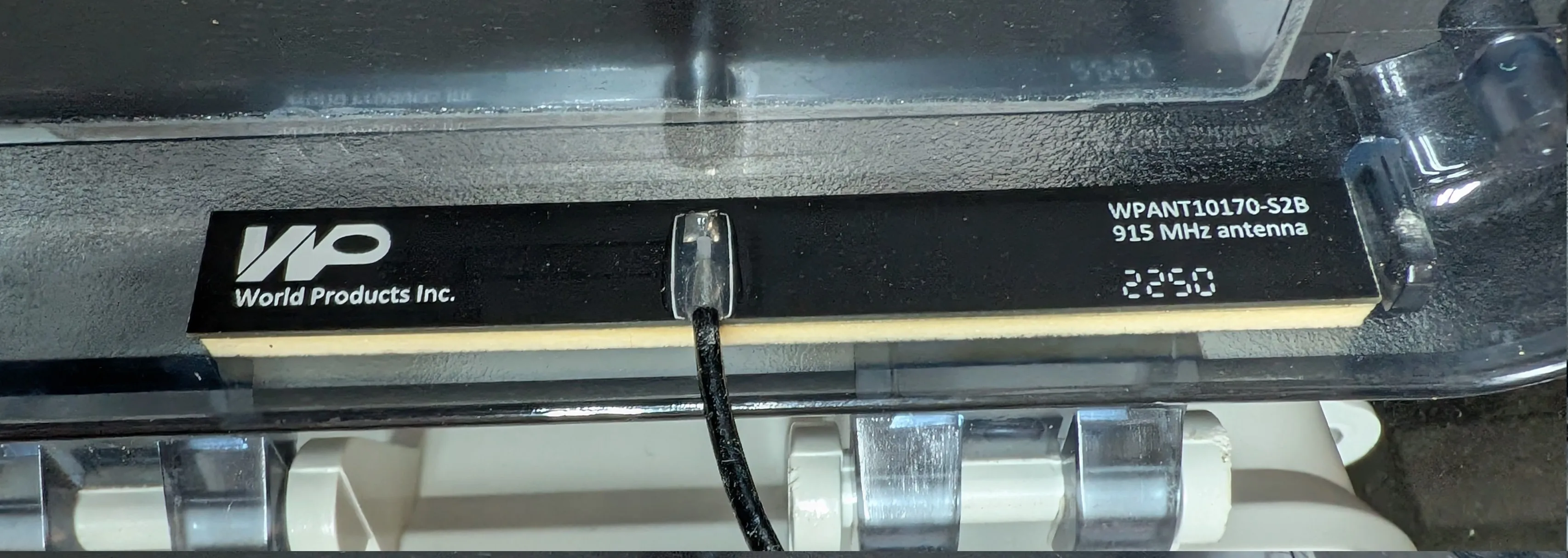 Small patch style antenna (WPANT10170-S2B) for the radio attached to the side of the ’lid’ with a sticky pad.
