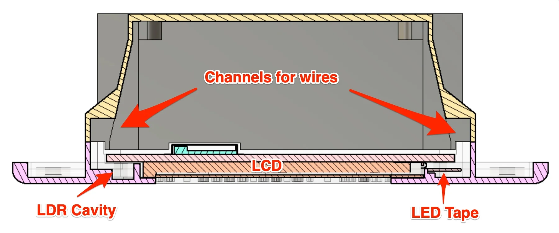 Section analysis from f360 showing small channels around the LCD for wires to LDR and LEDs