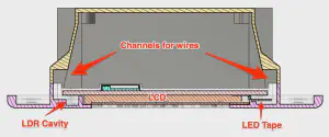 With zero room to spare, four LEDs can fit into a small cavity between the LCD and decor plate surface. Like with the LDR, there is no visual ’tell’ that there are LEDs beneath the surface… unless they’re on, of course.
