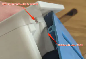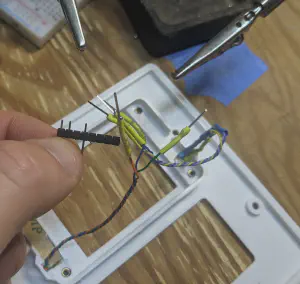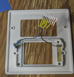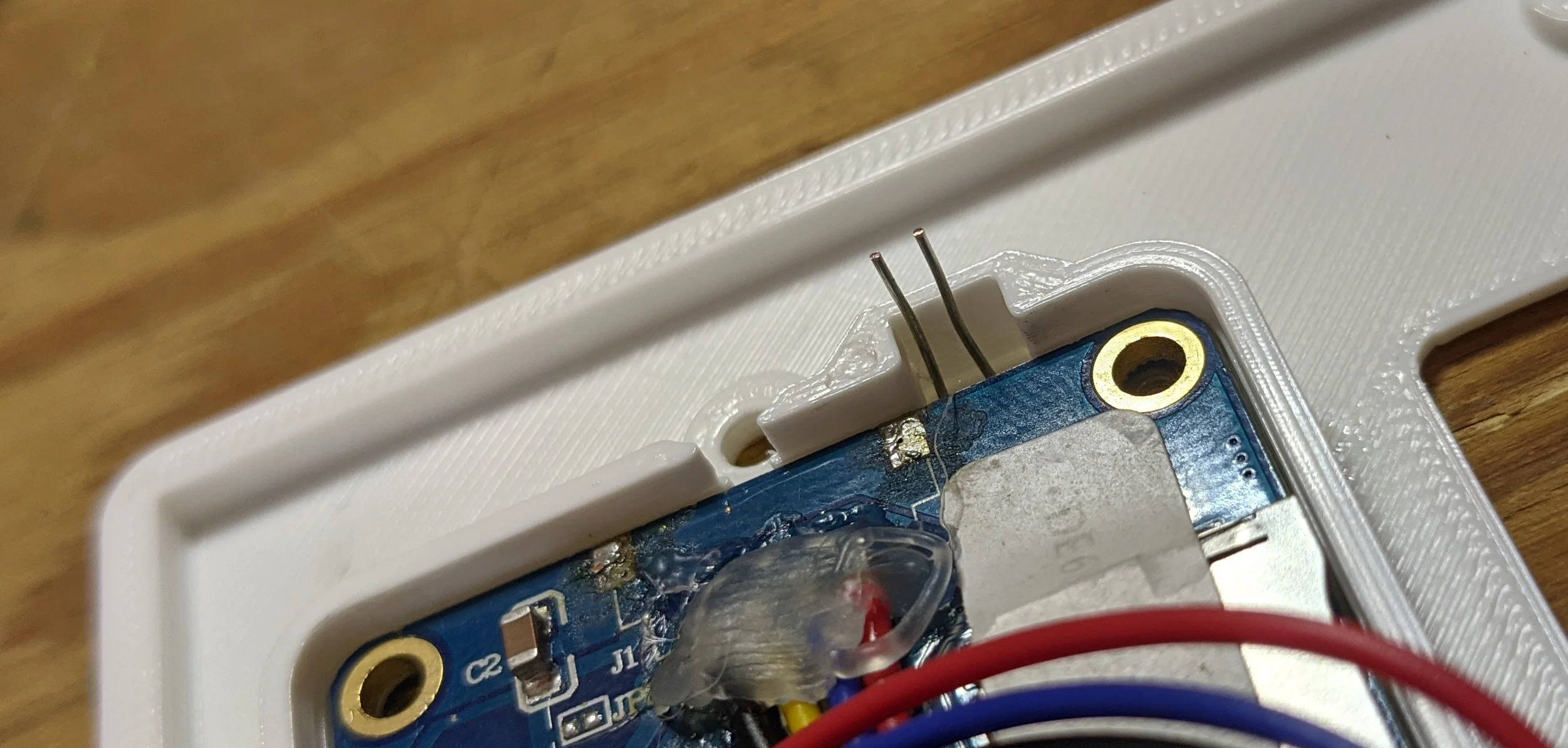 Without consuming more than 1 gang, the only realistic way to get the wires for the new components to the HASP PCB is to go around the edge of the LCD’s PCB. This is accomplished with two small ‘channels’ that slightly protrude in the vertical directions from the lip around the LCD and into the box that encloses the electronics.