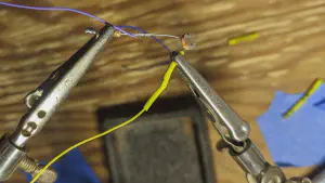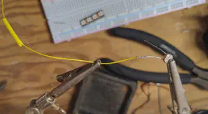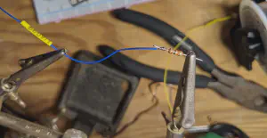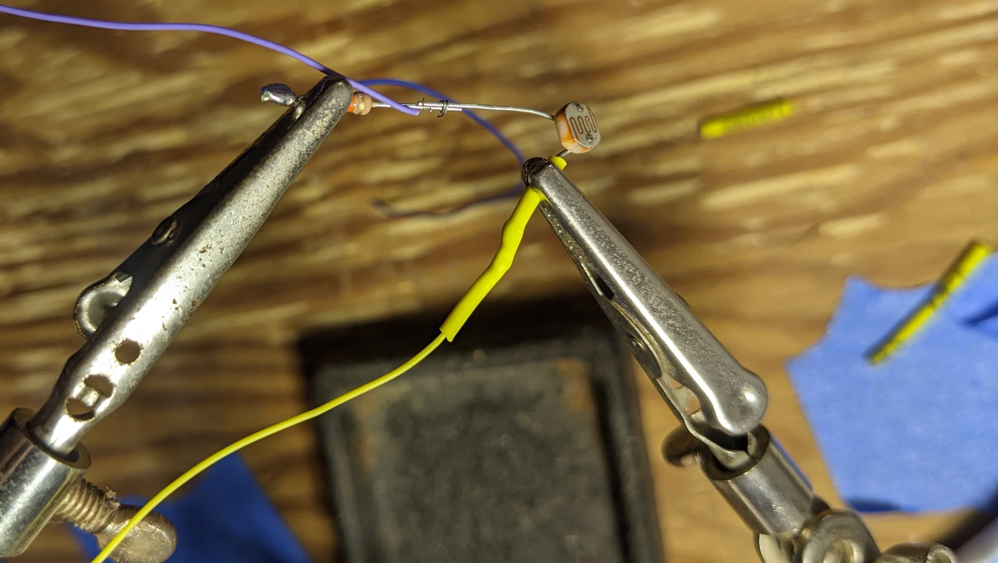 Repeat the same procedure with the lead of the resistor that will go directly to the ground. Affix the HST after the solder joint has cooled.