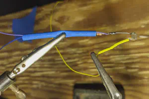 Make sure that HST is on the wire(s) before soldering! After the solder joint cools, slip the HST over the solder joint and apply heat until the joint is covered. Repeat this process for the remaining pins. There will be three ‘unused’ pins that you can just ignore.