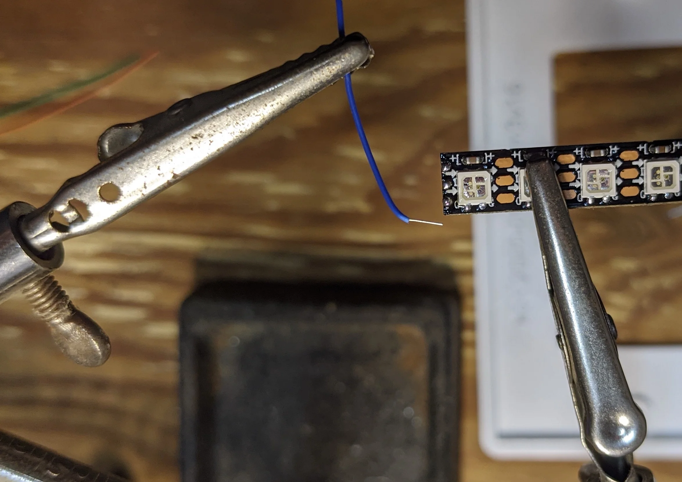 The LED tape has incredibly small pads so take your time on this. You have about 5 cubic millimeters total for the three solder joints on the LED tape. Solder just enough for electrical contact, there will be no significant mechanical stress. Note: The arrows printed on the strip point in the direction of data flow; combined with the off-center placement of the LED packages, there is only one way to properly install the LED tape in the decor plate.
