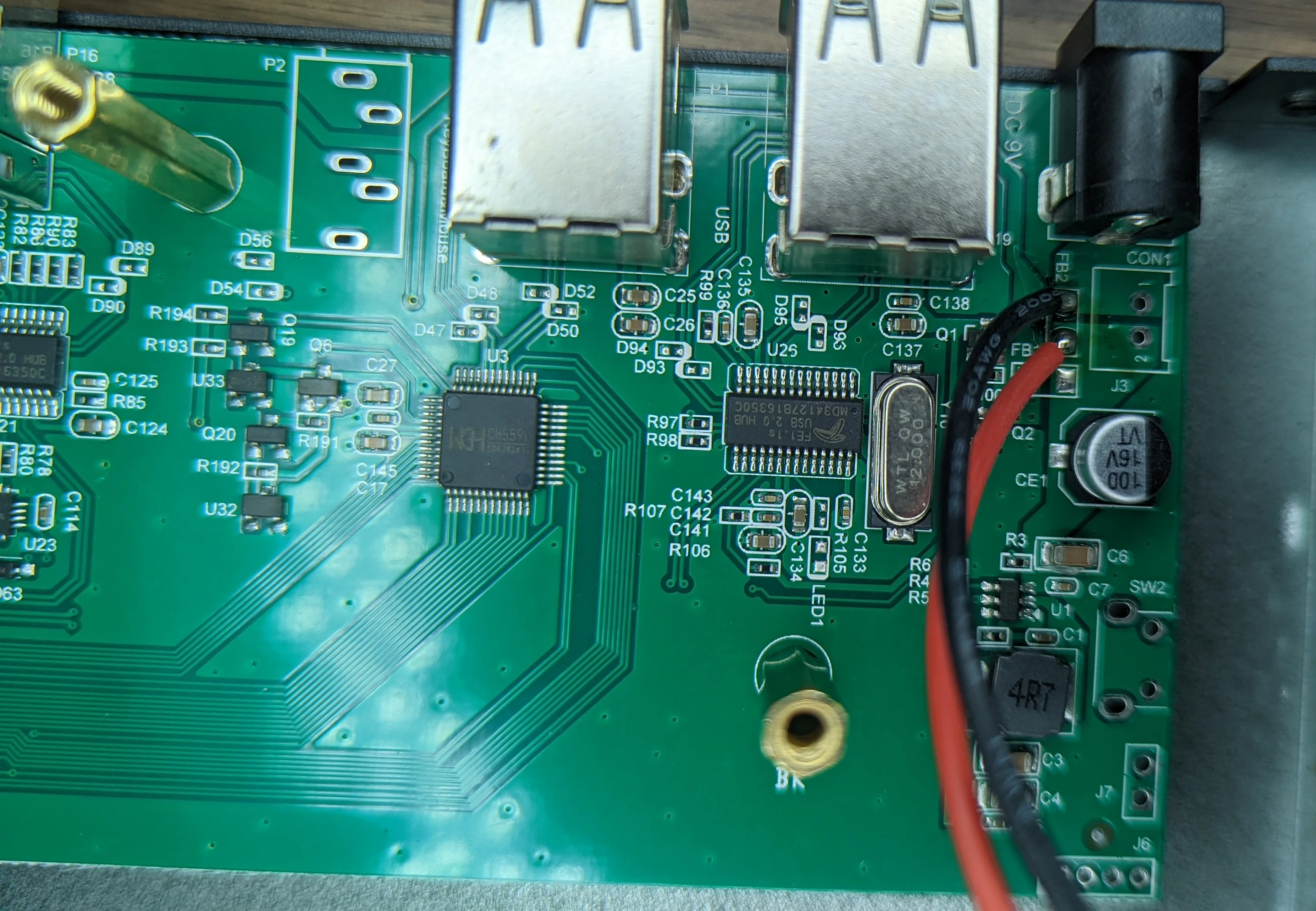 Near the 4 ‘output’ USB ports, you can see the CH559L which runs the show. This IC is monitoring the USB bus for key codes from the keyboard for display switching purposes; press some key combination to switch inputs.