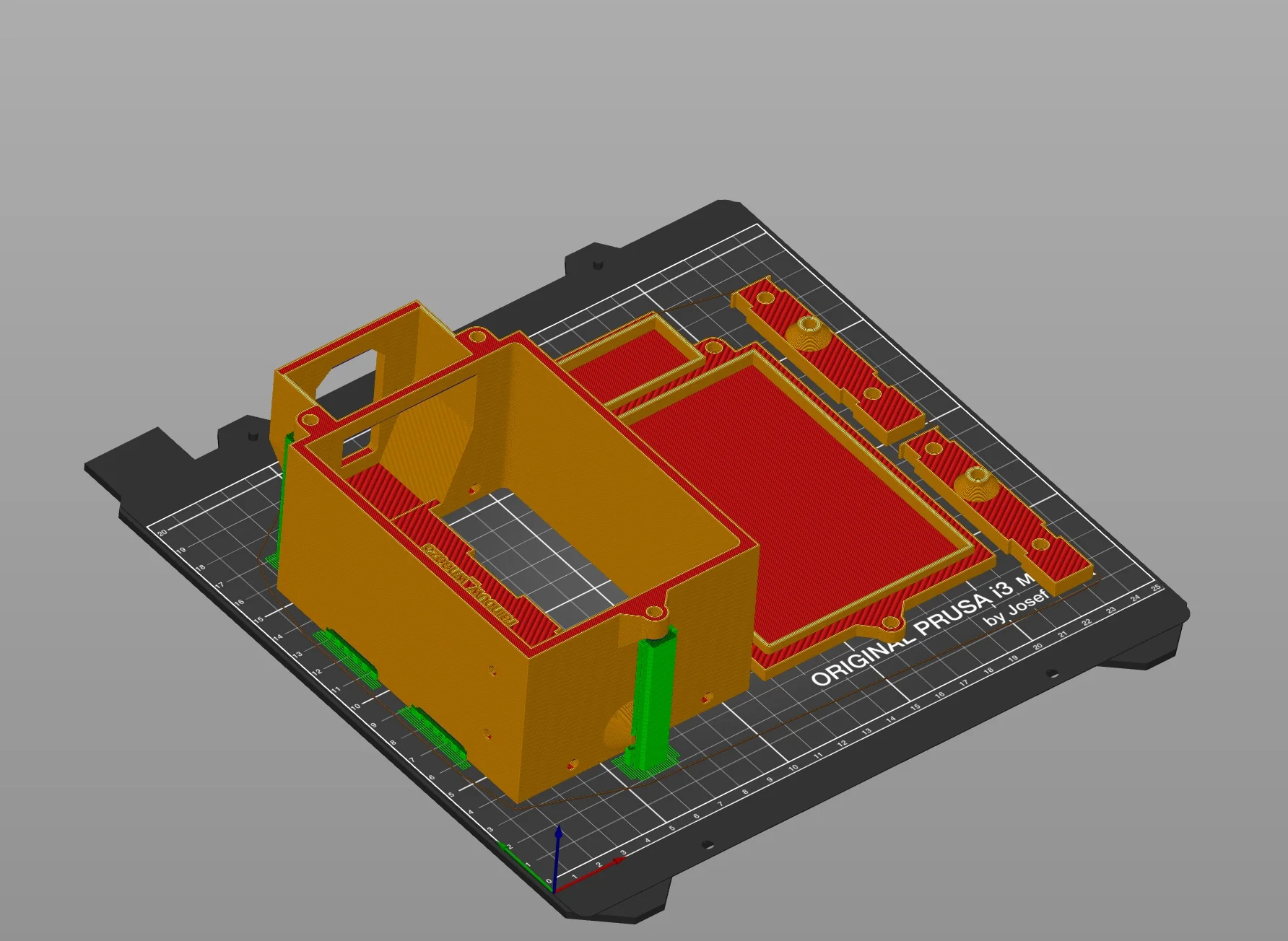 Print Bed arrangement, green is support structures
