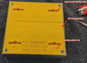 The m3 screws are for attaching the PCB to the printed part (in yellow, below) The shorter m4 screws are for attaching the base (yellow) to the lid (dark blue) and the longer screws are for attaching the stack light to the lid.
