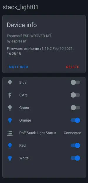 It wouldn’t be an ESP32 powered project w/o the the fantastic ESPHome framework! With ESPHome comes trivial Home Assistant integration; each individual light / channel on the stack light is automatically configured via MQTT a a light: