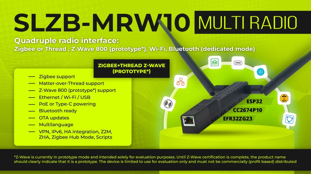 Specifically, the Silicon Labs EFR32ZG23 implements Z-Wave 800 (+ Long Range) and the Texas Instruments CC2674P10 implements Zigbee 3.0 or Thread.