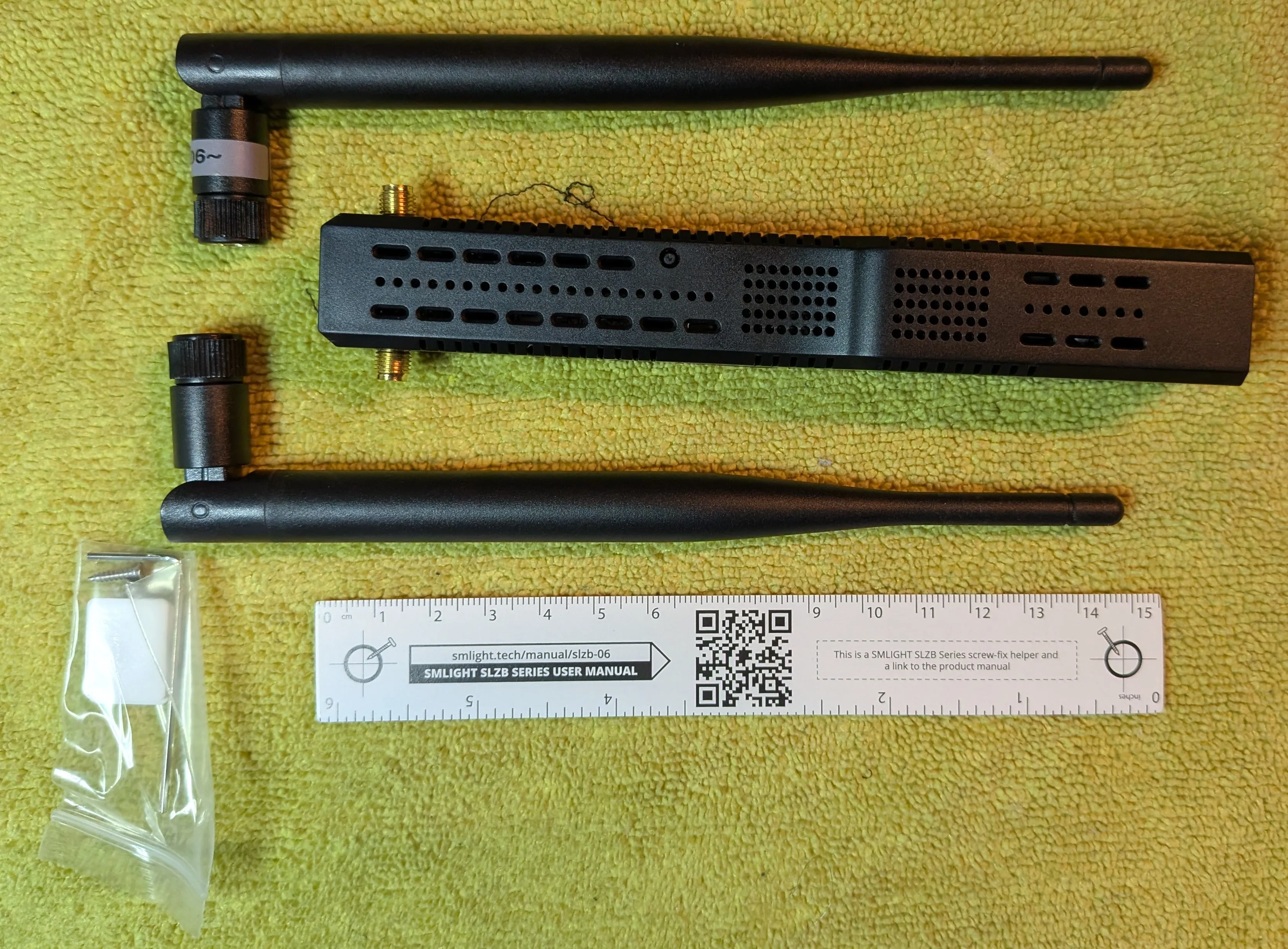 In the box you get the main radio unit, antennas and some misc mounting hardware / a template to help with spacing for the wall mount. I love it when they include a template instead of just saying “measure and drill holes yourself”. Bonus; the QR code links to the documentation page.