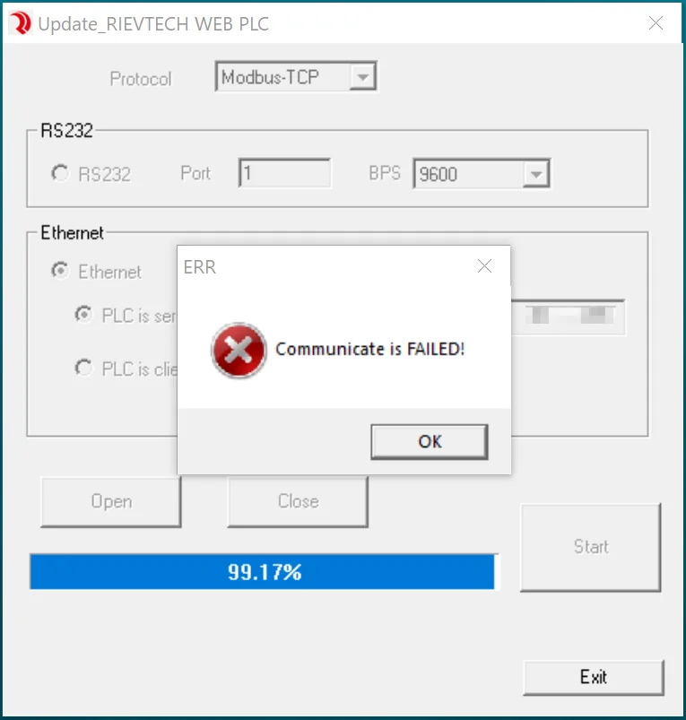 The PLC seemed ‘alive’ as I could still see arp packets coming from it’s ethernet port on boot and the web server seemed to accept my connection but never return any data. Even after restarting the PLC, the firmware updater was able to open a new connection and flash the firmware… always failing at the same spot: 99.17%.