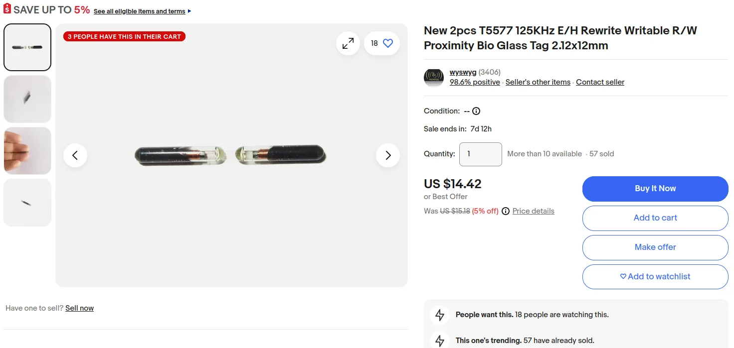 Page included: 2pcs 125KHz T5577 Writeable Glass RFID TAGS