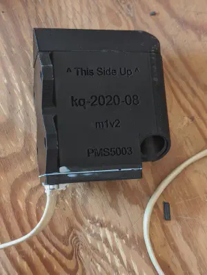 The sensor uses a small fan to draw ambient air past an infrared laser. As airborne particles cross the laser beam, they reflect a certain amount of light which can be correlated with the size of the particle. This data can then be turned into fairly accurate counts of how many particles of a given size are in the sampled air. The enclosure is a basic box with two circular air channels pointed downwards to prevent moisture ingress. The intake and exhaust ports are at staggered heights and pointed in opposite directions and to minimize the chance of recirculating the same air.