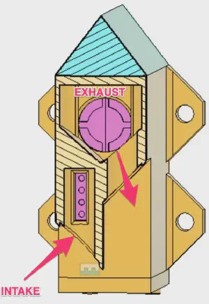 The lower port is the intake which connects to a few small holes on the front of the sensor and the exhaust port is the raised port which connects directly to the exhaust fan. If you could remove the first few mm from the front, it would look something like this: